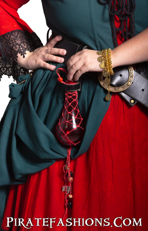 Here be a larger capacity, long round bottle to carry the pirate's essence - RUM. The brown or black leather strap will hold it securely to yar belt. The knot work is all done by arrr lovely wenches n' the cork be tied to the bottle so ye will not lose it in a drunken state.