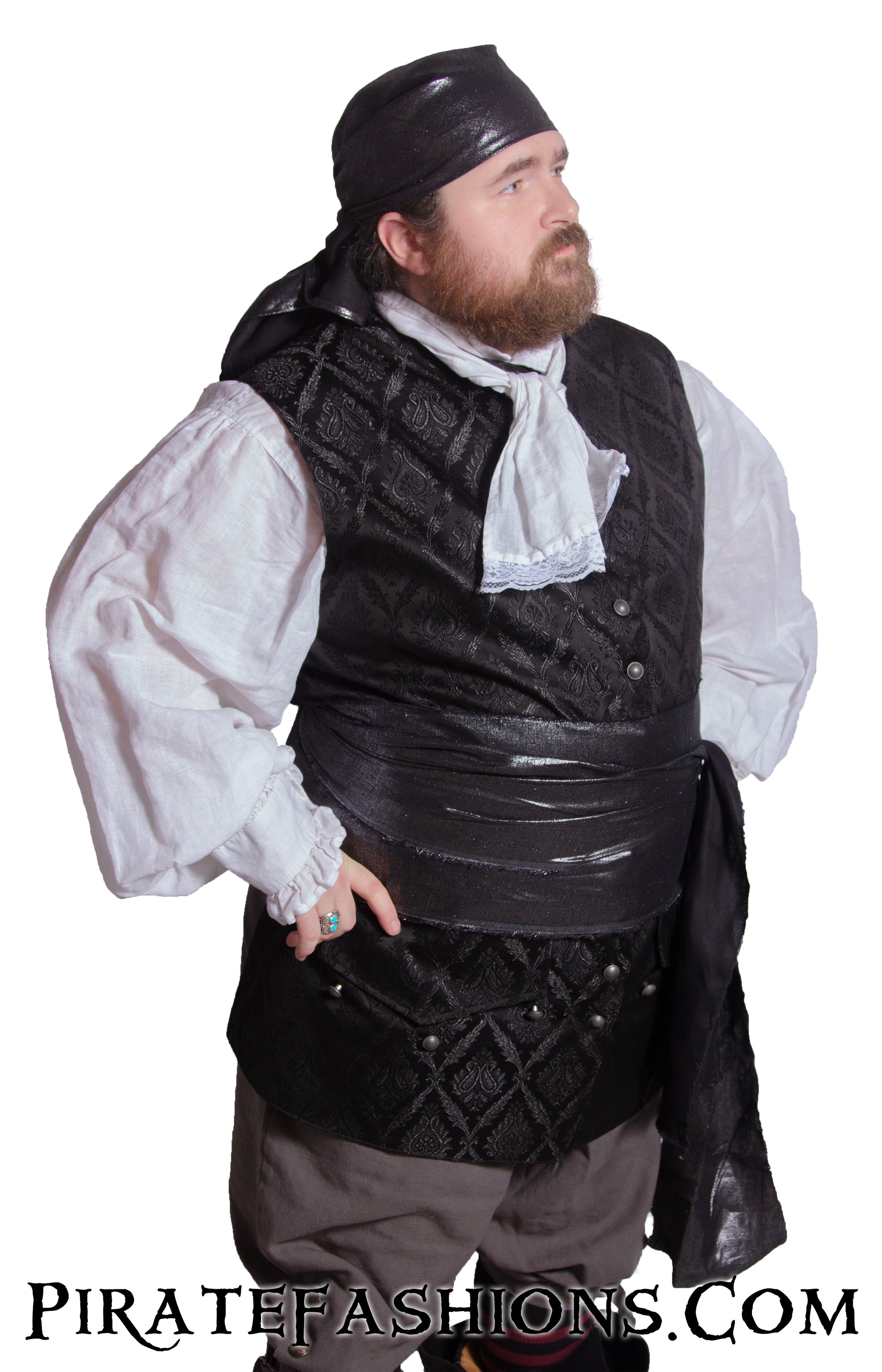 This stylish waistcoat be inspired by arr Revolutionary era Jack Waistcoat, but fer pirates who be wanting a fancier flair to their wardrobe. Perfect fer swashbucklin' in style! Model is 5'8" and wears size XXL.
